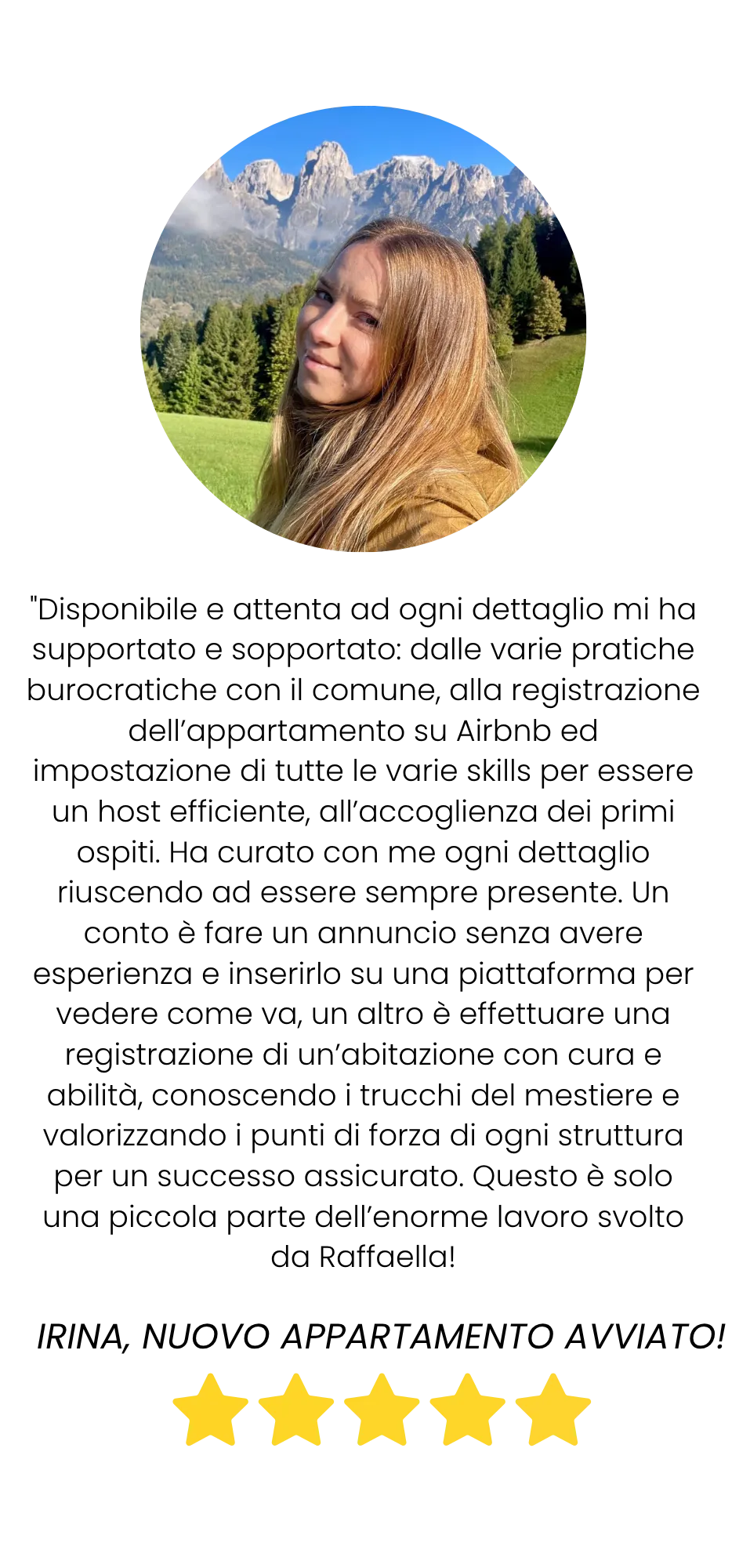 Ha curato con me ogni dettaglio riuscendo ad essere sempre presente. Un conto è fare un annuncio senza avere esperienza e inserirlo su una piattaforma per vedere come va, un altro è effettuare una registrazione di un’abitazione con cura e abilità, conoscendo i trucchi del mestiere e valorizzando i punti di forza di ogni struttura per un successo assicurato. Questo è solo una piccola parte dell’enorme lavoro svolto da Raffaella!