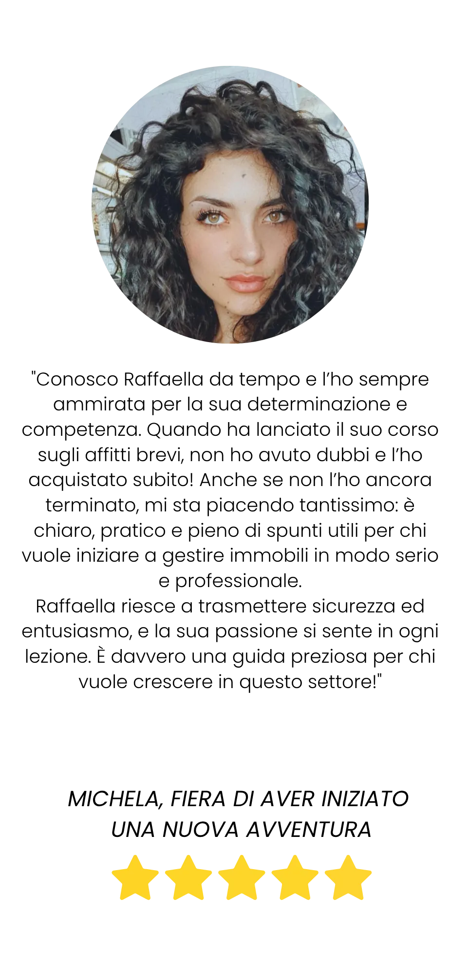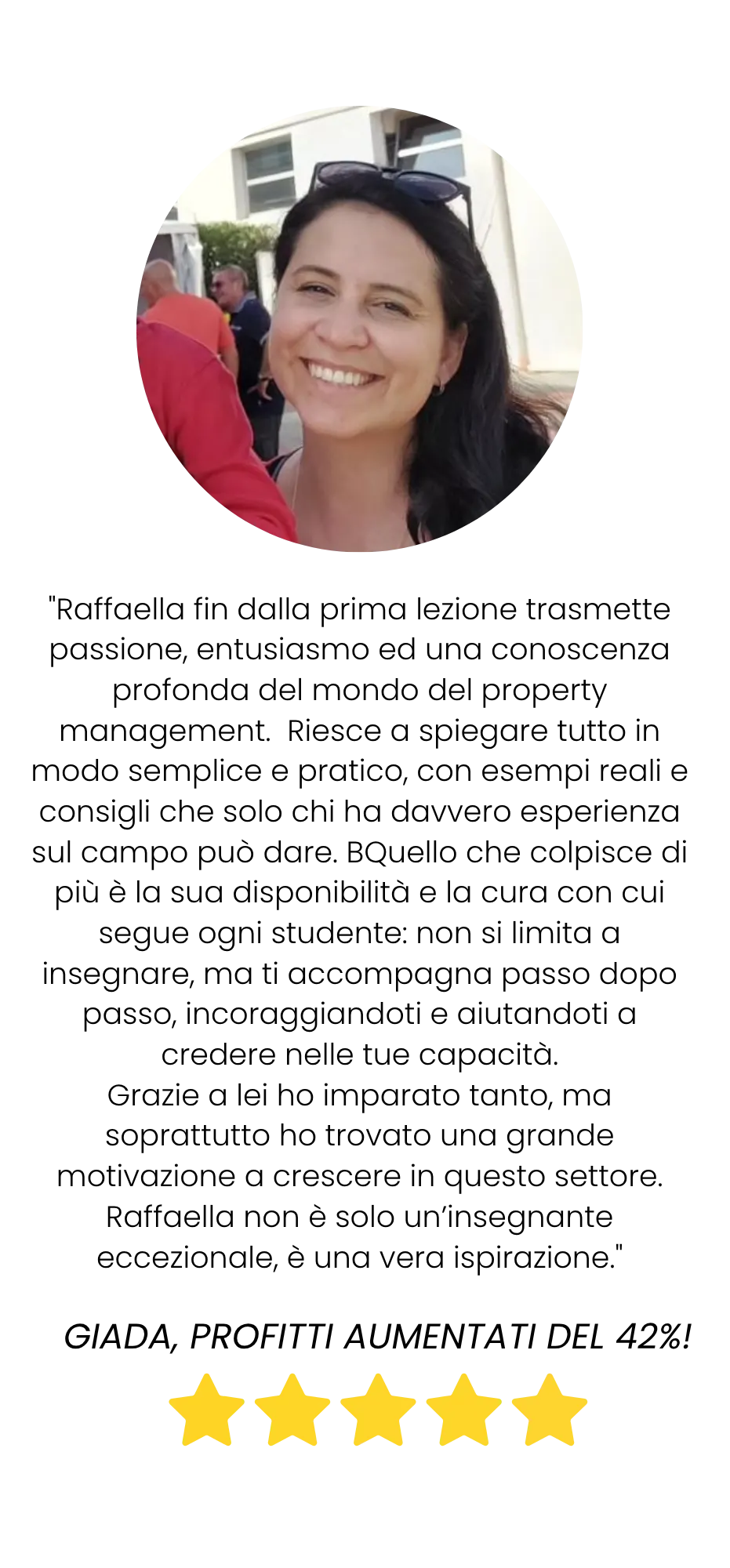 "Conosco Raffaella da tempo e l’ho sempre ammirata per la sua determinazione e competenza. Quando ha lanciato il suo corso sugli affitti brevi, non ho avuto dubbi e l’ho acquistato subito! Anche se non l’ho ancora terminato, mi sta piacendo tantissimo: è chiaro, pratico e pieno di spunti utili per chi vuole iniziare a gestire immobili in modo serio e professionale.