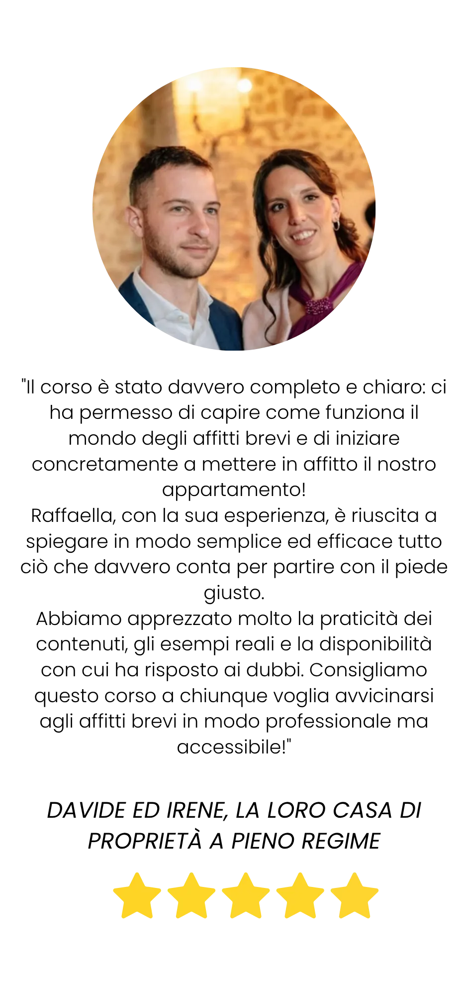 "Il corso è stato davvero completo e chiaro: ci ha permesso di capire come funziona il mondo degli affitti brevi e di iniziare concretamente a mettere in affitto il nostro appartamento!